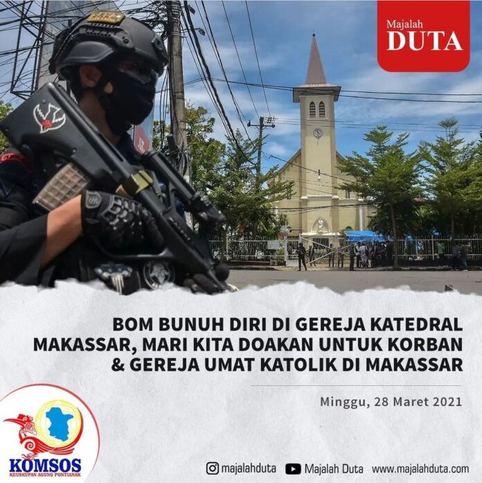 MajalahDUTA.Com, Pontianak Hari Minggu, 28 Maret 2021, pukul 10.26 Wita, lokasi pintu gerban garah Jalan Kajolalido, depan pagar Gereja Katedral Makassar telah terjadi peristiwa serangan bom bunuh diri di tengah situasi Umat Katolik yang sedang memulai