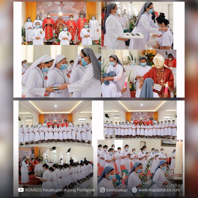 Prosesi penerimaan 18 Postulan, 15 Novis dan 3 suster novis berkaul perdana ini dibawa dalam perayaan Ekaristi di aula Rumah Retret Wisma Immaculata Pontianak yang dipimpin oleh Uskup Agung Pontianak, Mgr. Agustinus Agus, didampingi oleh Pastor Ambrosius Pr, Pastor Elenterius SVD dan Pastor Yosef Astono Aji OFMCap.
