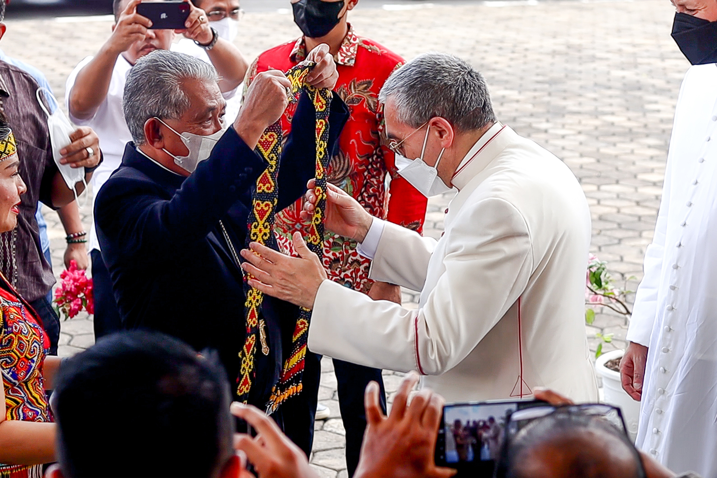 Sebelum transit ke dalam mobil yang akan membawany ke Sanggau, Nuntius dikalungkan sal dan topi manik-manik khas Dayak oleh Mgr. Agustinus Agus sebagai tanda selamat datang di bumi Kalimantan Barat.