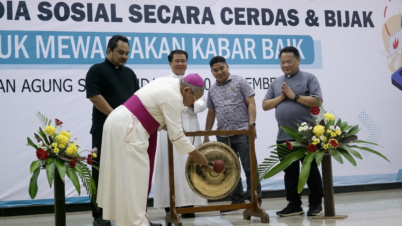 Temu Resmi itu dibuka dengan pemukulan gong sebanyak lima kali, oleh Uskup Agung Samarinda, Mgr. Yustinus Harjosusanto MSF, didampingi oleh Ketua KOMSOS Keuskupan Agung Samarinda (KOMSOS KASRI), Pastor Moses Komela Avan, serta Sekretaris Jenderal KOMSOS KWI, Pastor Antonius Steven Lalu, bersama Komsos Regio Kalimantan.